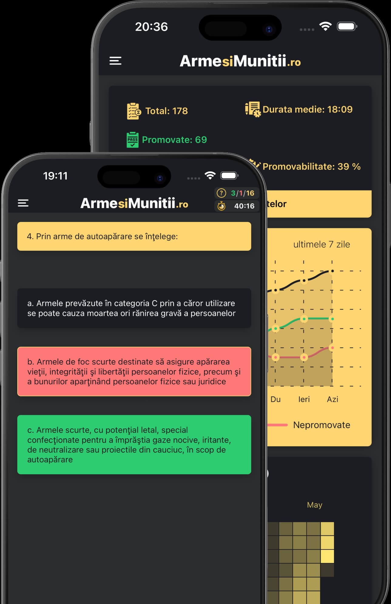 Suntem singura platformă care oferă chestionare special concepute pentru cursanții care doresc să obțină permisul pentru arme și muniții.